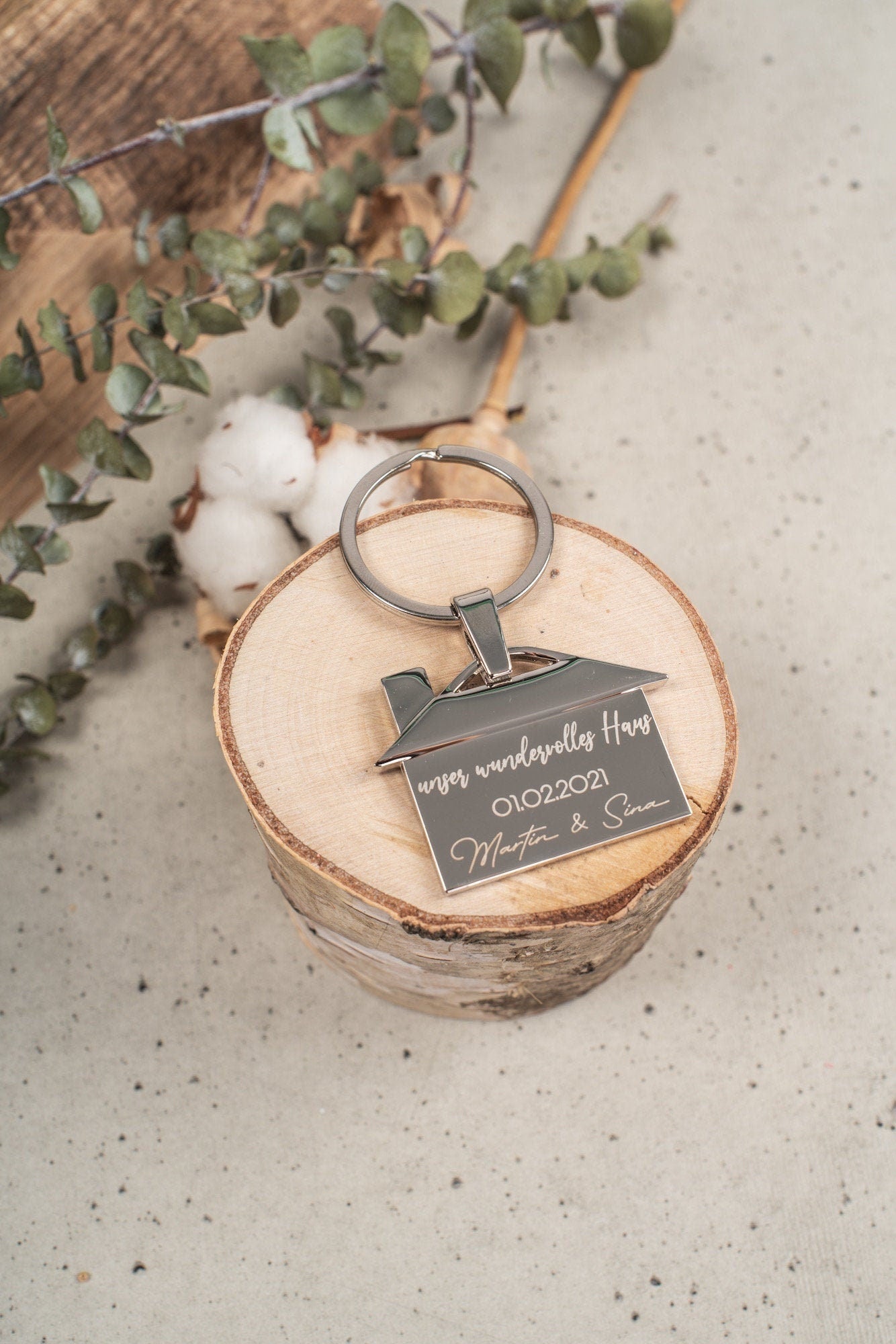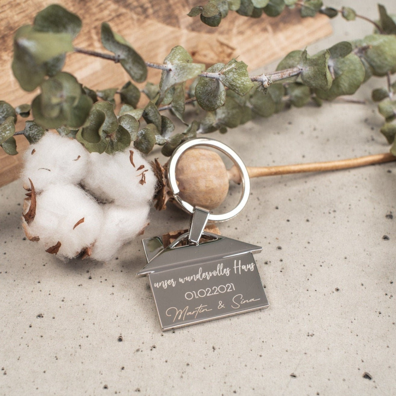 Schlüsselanhänger Haus aus Edelstahl mit Wunschnamen und Daten