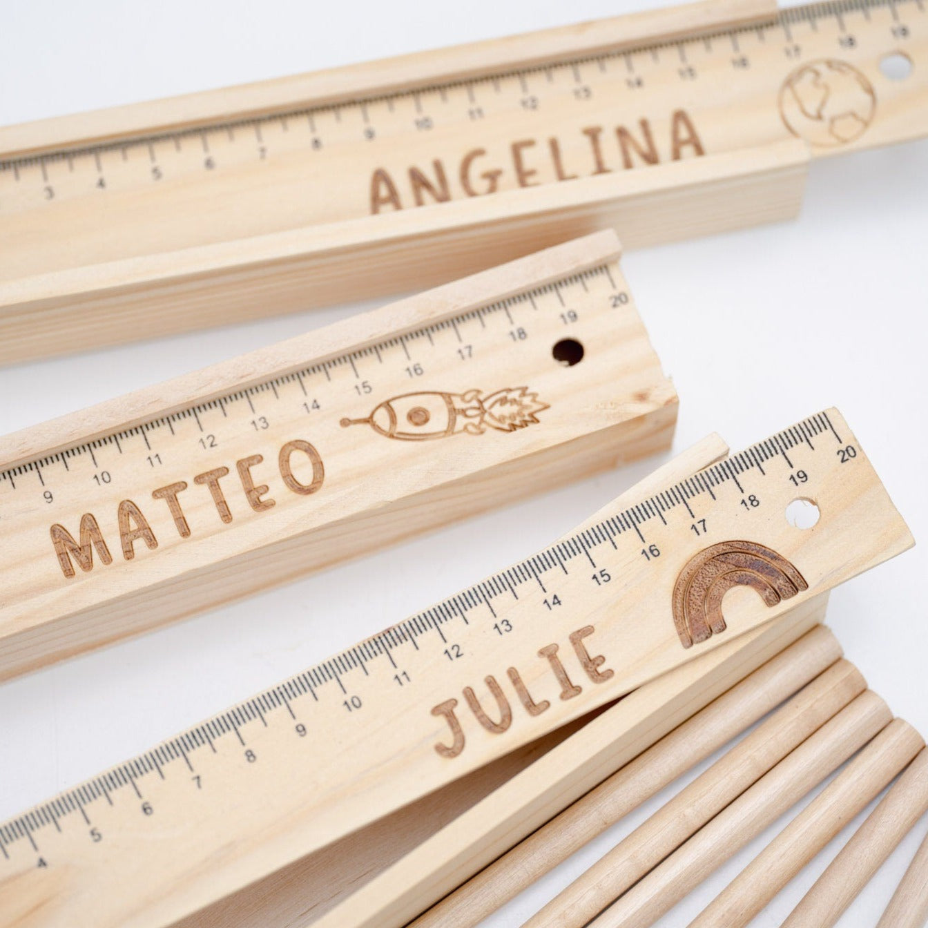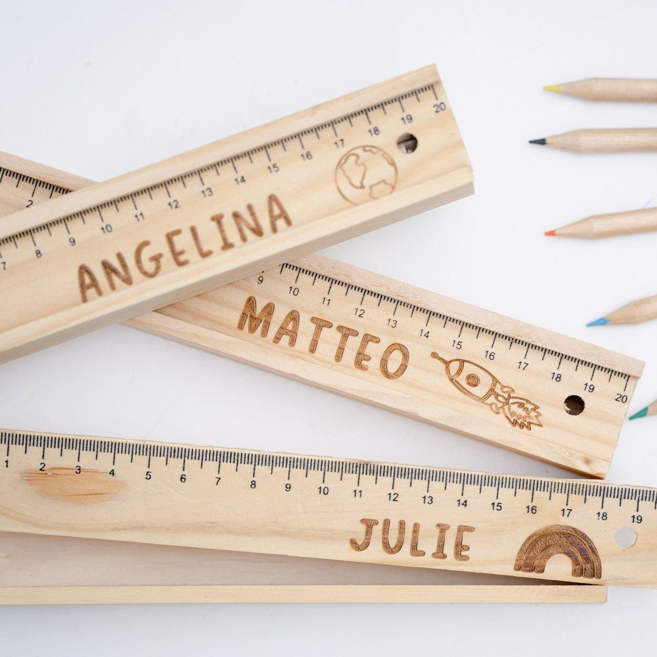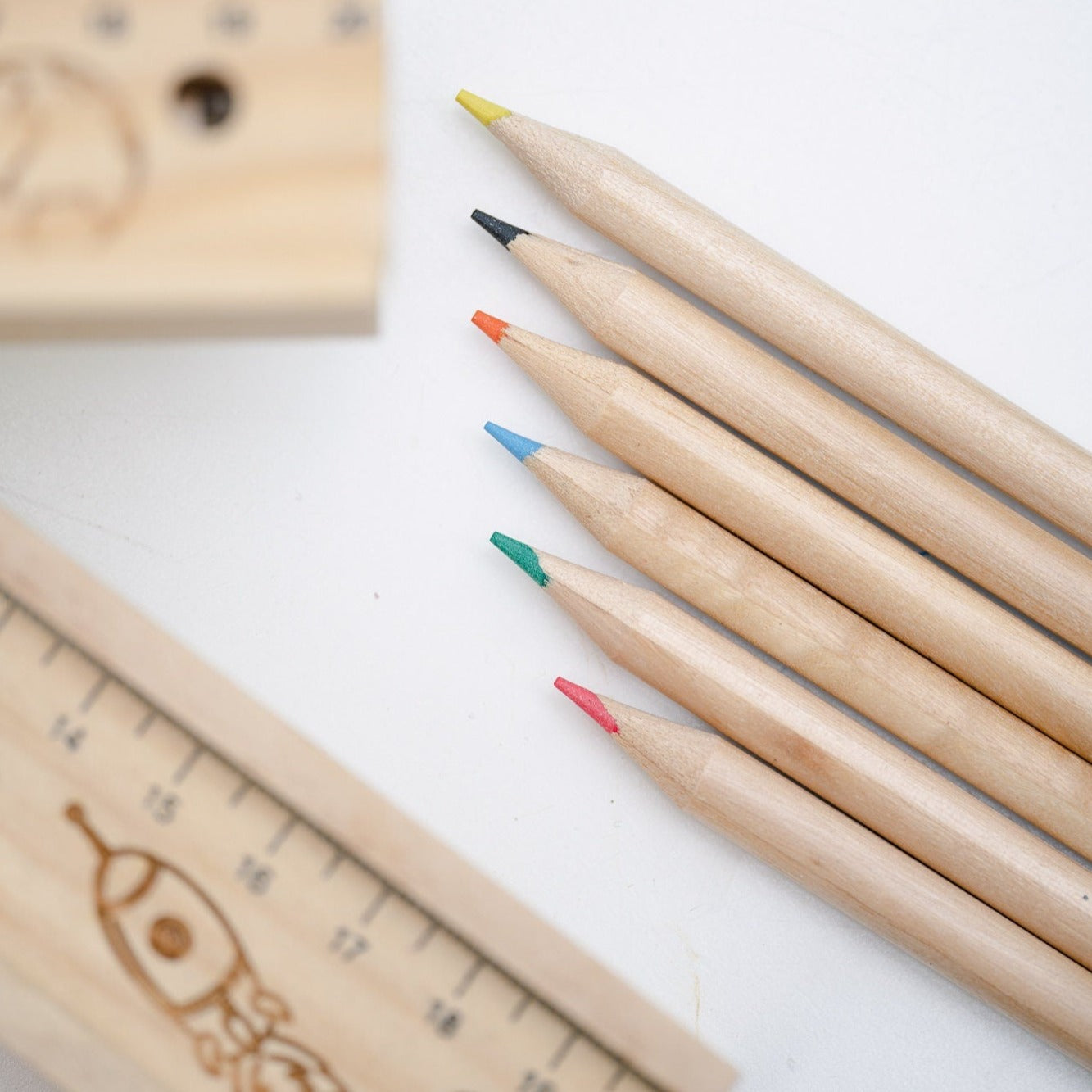Die Stiftebox kommt mit 6 Buntstiften, einem rutschfestem Deckel (integriertes 20 cm Lineal) und deiner Wunschgravur.